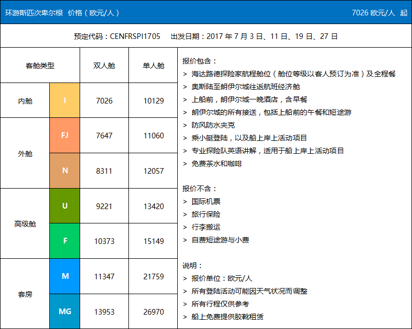 1. 本产品提供的舱位,每位乘客均须占床。客人若出现单男或单女需另补单间差。