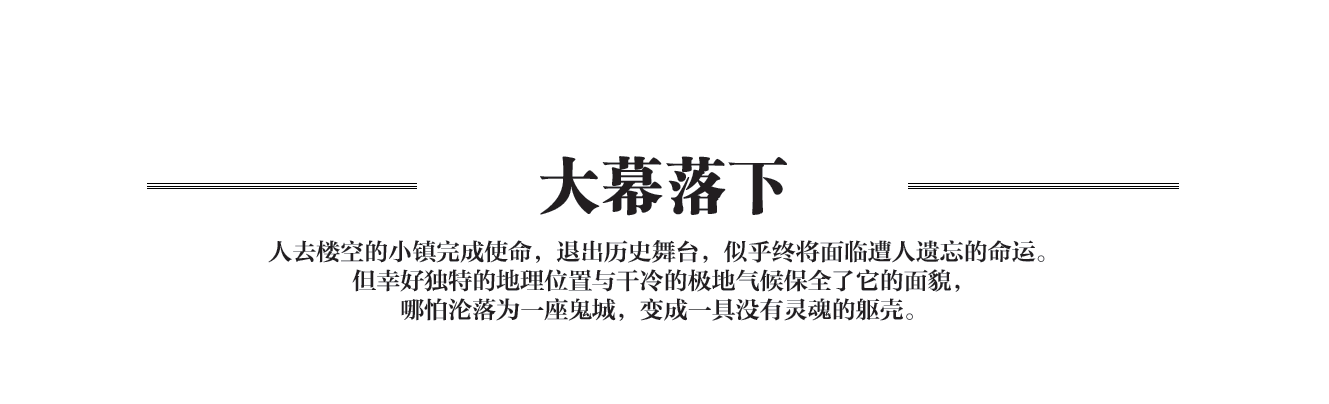 人去楼空的小镇完成使命,退出历史舞台,似乎终将面临遭人遗忘的命运。但幸好独特的地理位置与干冷的极地气候保全了它的面貌,哪怕沦落为一座鬼城,变成一具没有灵魂的躯壳。