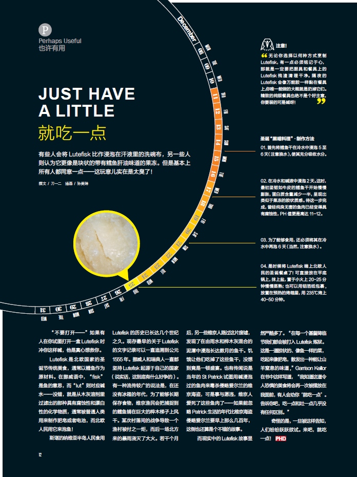 Lutefisk是北欧国家的圣诞节传统美食,通常以鳕鱼作为原材料。在挪威语中,“fisk”是鱼的意思,而“lut”则对应碱水——没错,就是从木灰溶剂里过滤出的那种具有腐蚀性和漂白性的化学物质,通常被普通人类用来制作肥皂或者电池,而北欧人民用它来泡鱼!